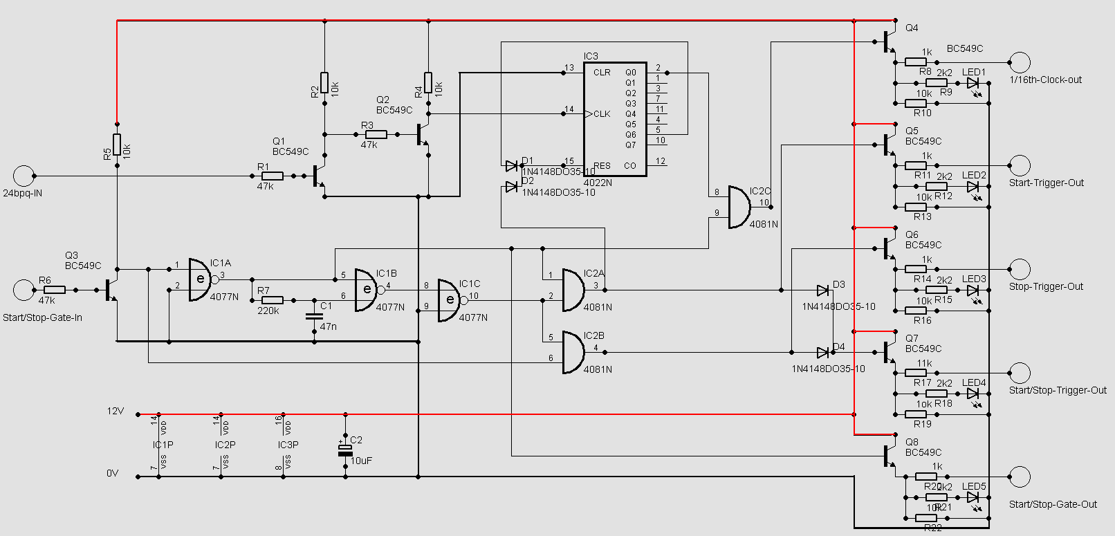 This converts the 24 beats per quarter clock from the DIN-Sync to a 1/16th Trigger clock suitable for the A-154/155 or any other analogue sequencer or rhythmmachine. It also converts the Start/Stop-Gate provided by the DIN-Sync into separate triggers for Start and Stop and also to a combined trigger (as in the Doepfer A165).
