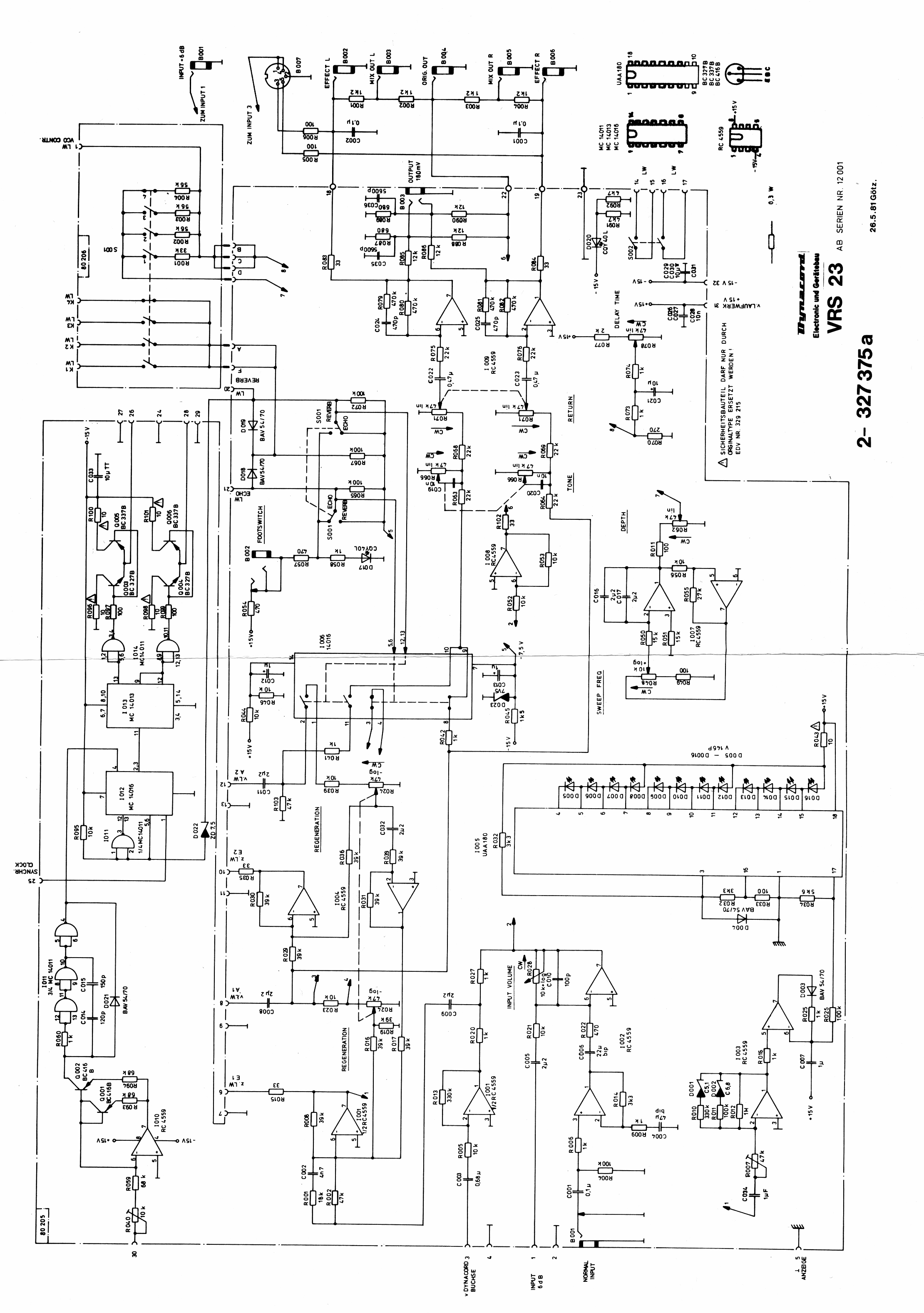 The Dynacord VRS 23 is a analogue audio delay, which uses bucket bridge delays (BBDs). It has a Mono-In and a Stereo-Out. The delaytime can be changed between around 400ms and very small delay times ( < 1ms). There are two modes: "Delay" "(a simple pingpong) and "Reverb" "(unsymmetrical delaytimes). The delay time can be modulated with an LFO, which gives effects between flangers, very smooth chorus and 70ties-It-Came-From-Outta-Space-Sounds.