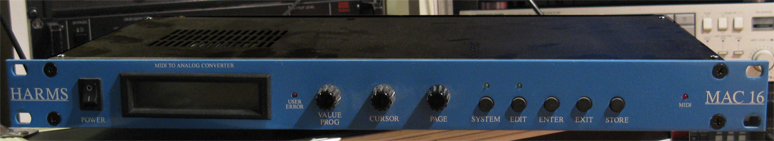 The Harms MAC16 is a rare MIDI-to-CV/Gate converter which was made by a small one man company Harms in Hamburg Germany in the late nineties. The original price was around 1250 Deutschmarks (about 600 Euro). It provides 16 channels, which can be configured for any kind of MIDI to analog conversion. Basically there are five modes: