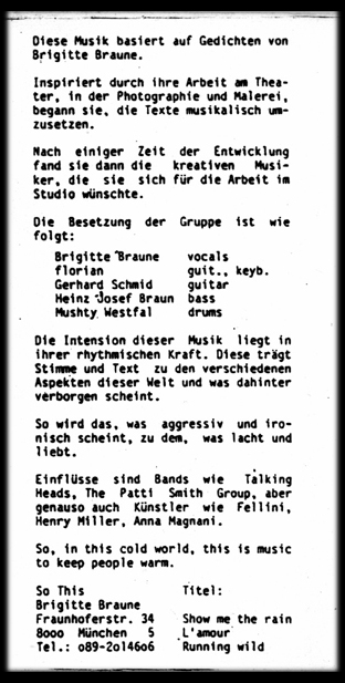 worden; natuerlich koennen Sie lange zuvor entstanden sein. "So This" was the band of the singer songwriter Brigitte Braune. The band existed from around 1983 until 1988 or 1989. For several years I was a main member playing the keyboards, producing the recordings and also as co-author of several songs. All songs are at Double You Musikverlag, Munich with exception of the cover versions (see the list below). Regarding the date of the songs I have noted as 1984 I am not sure about the real creation date; I got knowledge of them in that year and were put on record of the GEMA. But in fact they may be created much longer before. |