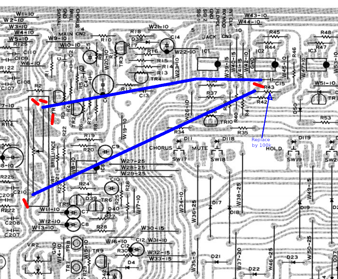 I removed the brilliance function and am using the brilliance pot for the chorus speed. Simply replace R43 by a 100k or 120k resistor in line with the pot VR1.