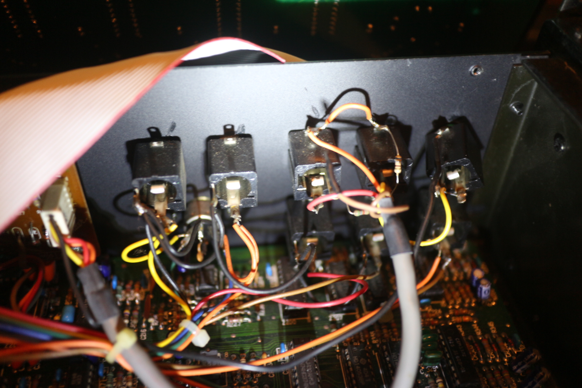 The moment I put the audio cable in it freezes, signal is giving a buzz. I think I am shorting the whole synth when the audio cable is inserted. Now it looks like someone has previously done something funky to jacks. My phones jack had broken away from the chasis so I just took it off and will replace it. If anyone has any clues from looking at the wiring of what it could be thats shorting it out. There are a couple of resistors bridging on the mono outputs. The brown wire has tape around it and has been put out of use. The black ground is going to the headphones along with a yellow that is bridged across by a piece of metal.